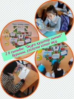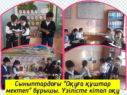 «Оқуға құштар мектеп» жобасы негізінде оқу жылының басында 5 бағыт бойынша іс-шара жоспары құрылып,жұмыстар жүргізілуде.Қыркүйек айында әр сыныпта «Оқуға құштар оқушы» деген тақырыпта бұрыштар ұйымдастырылды.Қоңырау арасында оқушылар сол кітаптармен танысып,минутқа оқып,әңгімлер жүргізеді.