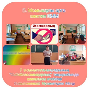 Әр сыныпта құқық бұзушылықтың алдын алуға байланысты ата-аналармен жиналыстар өткізіліп,сыбайлас жемқорлықтың алдын алу ,мектептің тәртіп ережелерімен,ата-ананың міндеті мен құқығы туралы түсіндіру жұмыстары жүргізілді.
